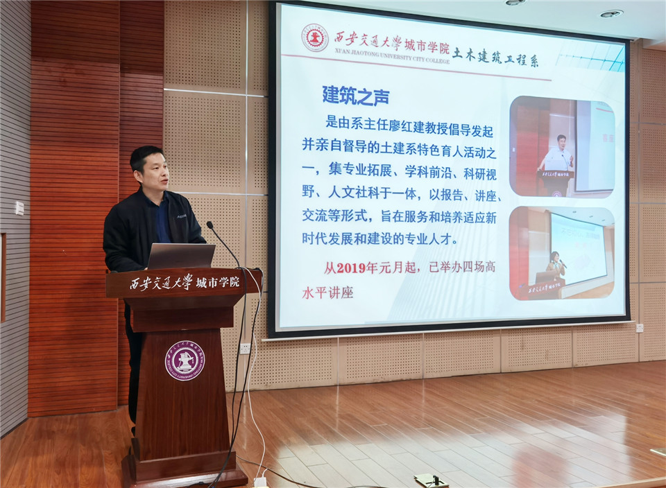 讲座开始前,廖红建教授进行了发言,她隆重地介绍了谢永利教授的履历,并讲到,“建筑之声”是土建系把握新时代立德树人新要求,发扬“西迁精神”,落实公司高素质应用型人才培养大计,通过教改实践探索,打造的综合教育平台。旨在帮助员工开拓视野,树立专业自信,培育创新思维,引导员工做到“知、信、行”相统一。不断优化专业教育与素质教育,培养具有大国工匠精神的新时代建筑人才和为国家伟大工程贡献力量的工程师,是城院土建人的初心和目标,希望师生共同努力,去创造和实现梦想。