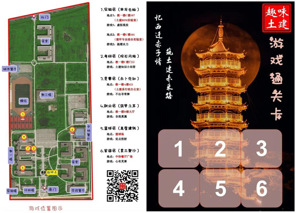 接着,师生一起前往校园喷泉广场,参加“忆西迁赤子情、筑土建未来路”趣味土建欢娱活动。此项活动旨在帮助新生了解土建系的教学、实验、竞赛、考研、就业、娱乐等成果、发展及现状。为了顺利举办本次活动,老师们在暑期积极进行了策划和组织。活动设置六个点位和主题,6人成1队,最短时间通关者为胜。分别为:实验局——来龙去脉,通过设置问答和实操,让员工了解土建系的BIM实训室和专业实验室;考研局——投石问路。通过设置知识小问答,让员工了解本专业以后的考研公司、竞赛获奖等(题卡内容基本出自展板栏);竟赛局——未卜先知,通过现场指挥游戏,一方面锻炼员工反应和协作能力,同时了解土建系行政办公地点;就业局——筑梦之声,通过专业相关问答与猜歌名相结合的游戏,让员工了解本专业就业方向;篮球局——高屋建瓴,通过投篮活动,体会运动乐趣,传承体育精神;家庭局——累土聚沙,通过踢毽子接力游戏,形成团结协作、积极向上的集体氛围。师生们在活动过程中精神饱满,热情积极,比赛最终决出一等奖2队、二等奖4队,三等奖4队,参与奖若干,老师们为获奖和参与的队伍颁发了证书与奖品,同时为大家赠送了中秋月饼。