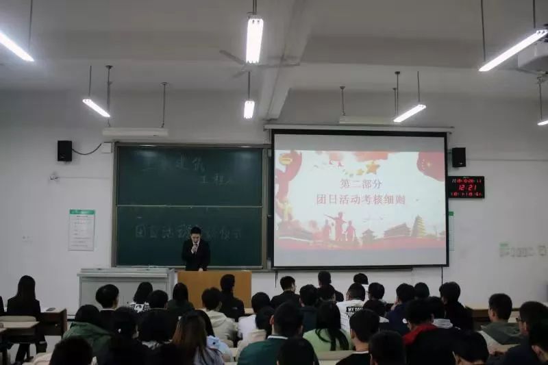 接下来土建系导员牛彦龙老师上台讲话,牛老师讲到团日活动是围绕建国70周年,不忘初心为大主题,希望各班能够参透本次活动的主题,认真学习,通过团支部,班委会策划有意义的活动。在组织过程中应该高效,不要假大空,不能流于形式。希望大家能够共同进步,取得收获。