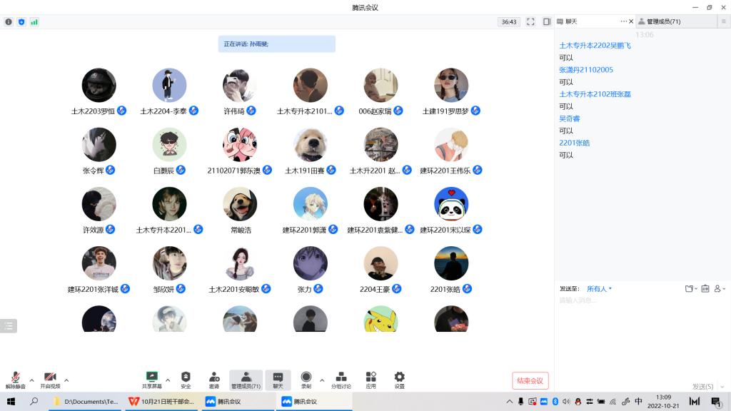 随后,土建系根据近期员工在学习和生活中存在的问题,组织召开了全体班干部线上会议,系副主任康彦青,系主任助理牛彦龙,教师兼班主任孙雨斐、刘益凡,团工委书记吴丹等老师参加了会议。首先,牛彦龙老师通报了近期员工管理教育中收集和师生反馈的问题,针对问题,对疫情期间核酸检测、健康打卡、主题教育、课外活动等工作进行进一步分工和部署。要求全体班干部担起责任,积极配合学工办、任课教师,积极为同学的学习和生活做好服务,一定要带头做好模范作用。接着,土木专升本2101班班主任孙雨斐及建环2201班班主任刘益凡依次指出了网课授课期间以及本次走访过程中发现的问题,要求全体班干部在网课期间起好带头和监督作用,一起保持良好的学习习惯,积极营造一个健康、认真的网课学习环境。最后,康彦青老师进行了发言和动员,对近期工作学习管理和生活纪律提出三点要求:一是要求班干部要尽职尽责,认真负责地做好核酸检测的督促以及监督工作,共同遵守公司疫情防控相关规定,严格做到非必要不外出,一起确保校园安全稳定。二是要求老师与员工干部监督好全体同学的学习过程,建议在网课结束后做好课后复习,对网课学习态度和行动懈怠的同学积极帮扶与教育。三是采取多种学习方法,建立学习小组,利用安静舒适的环境进行网课学习,线上线下保持同样的学习态度。