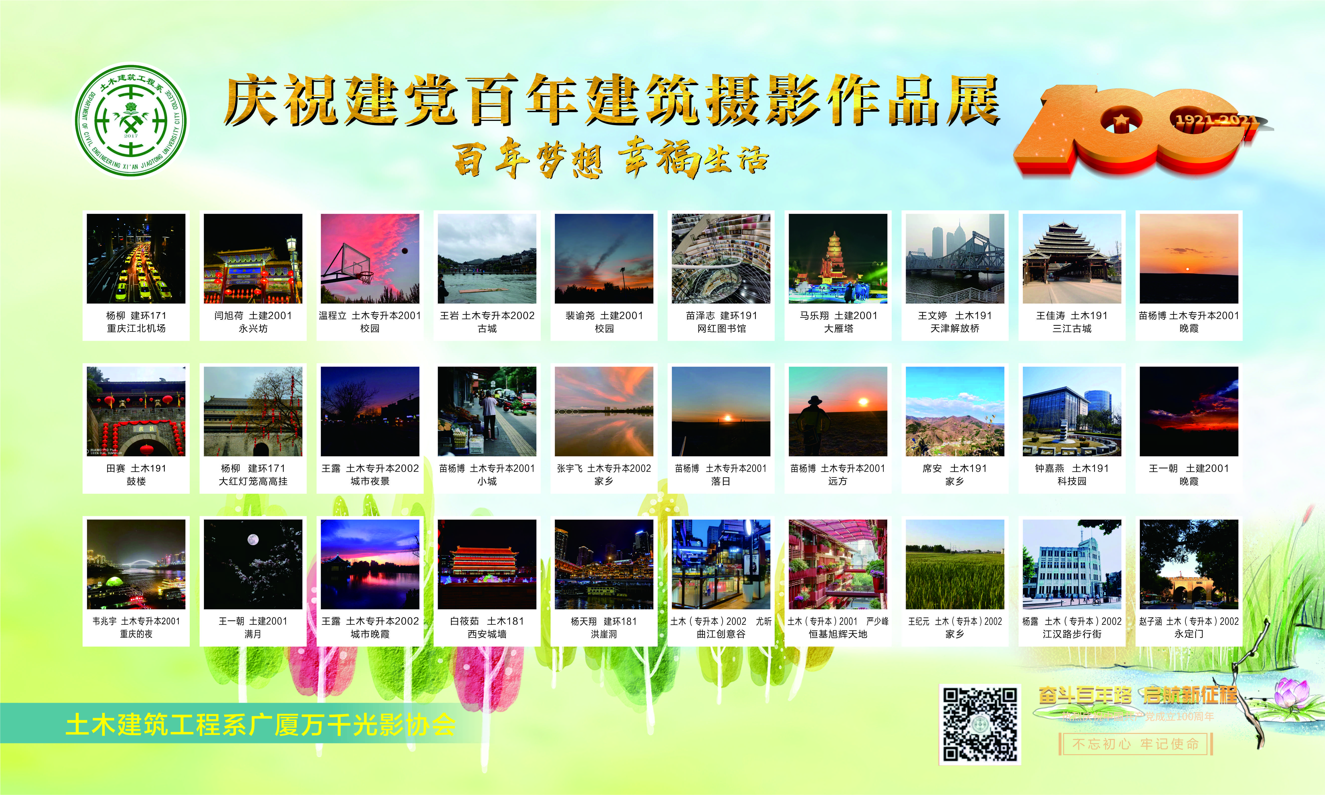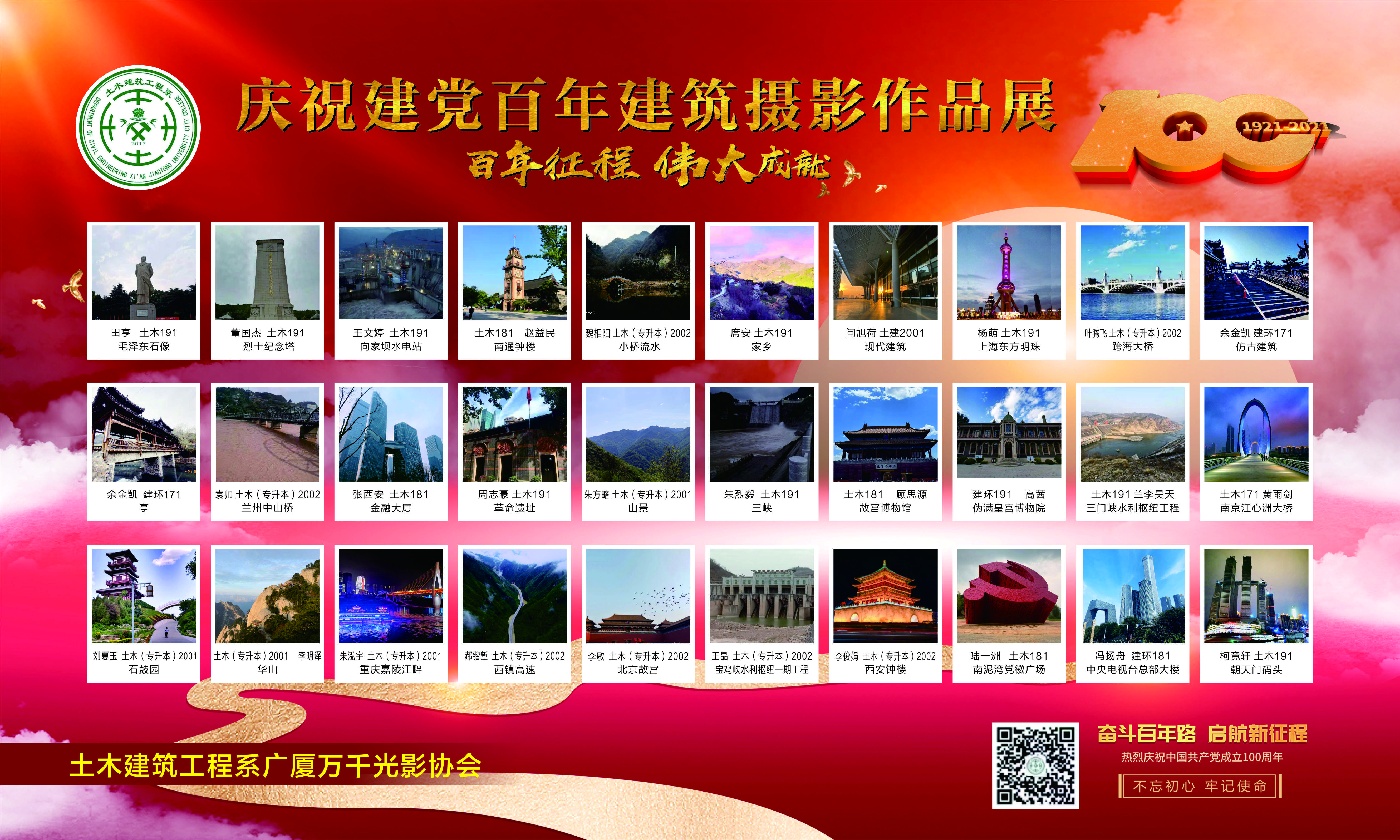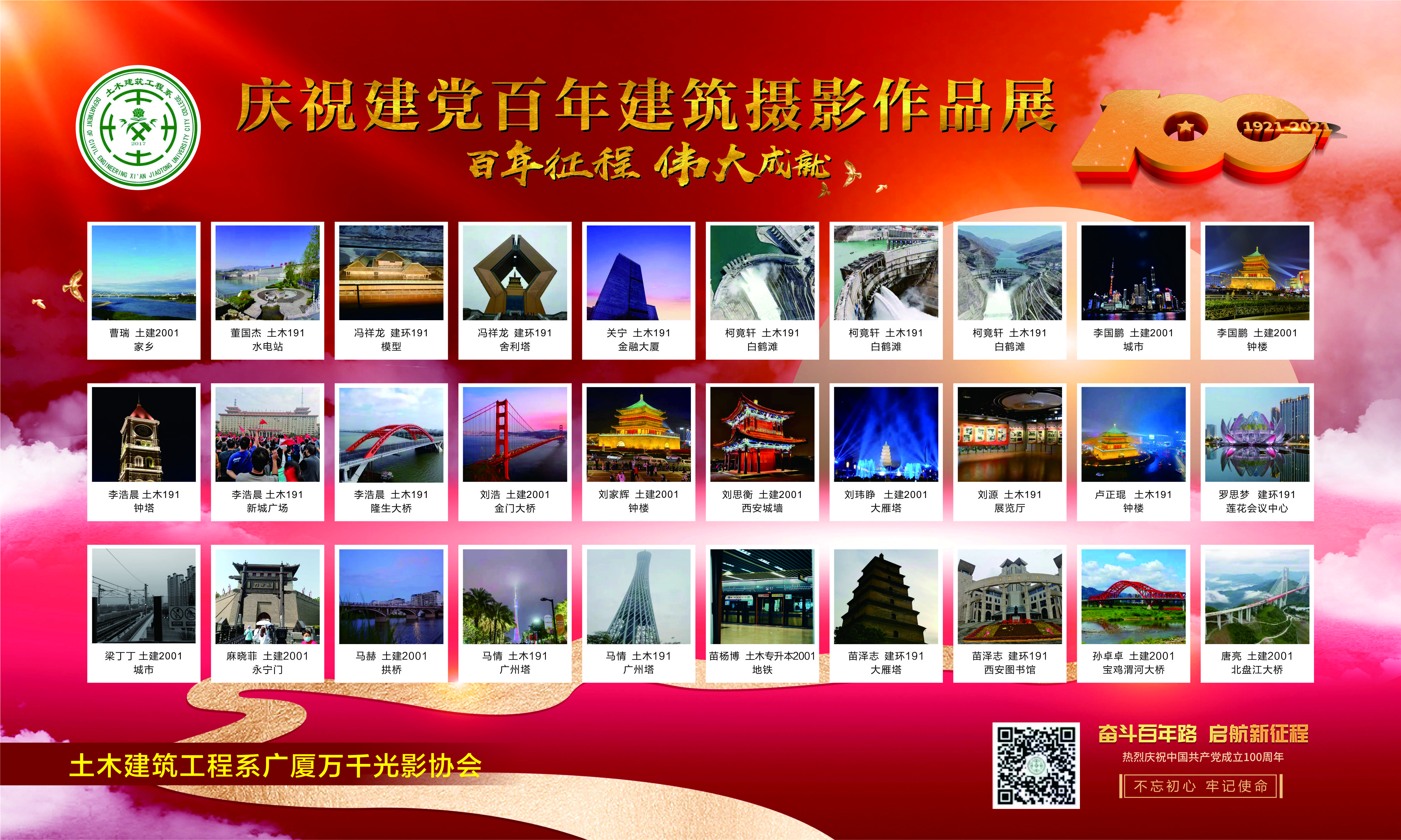 为庆祝中国共产党成立100周年,展现党的伟大成就及党领导全国人民创造的幸福生活,西安交大城市公司土木建筑工程系“广厦万千”建筑光影协会员工社团在本学期举办了“百年征程、百年梦想”摄影大赛,并将征集的优秀作品在“7.1”前后进行了为期一周的展出,营造欢庆氛围。