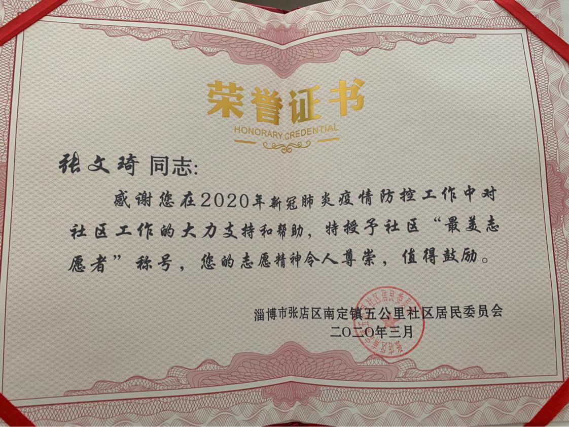 春节前,张文琦同学像往年一样,伴随着新年的临近,在家打扫卫生,布置年货。只是今年的春节,被一场疫情搞得人心惶惶,疫情的突然爆发,范围之广,让所有人都始料未及。随着疫情的逐步扩大,全国各地开始封城封路,社区进出也严格管制。眼看着形势愈发严重,张文琦同学意识到要为社区人民做些什么。在看到公众号平台宣传的招募志愿者的活动后,他在第一时间报上了名。作为一名员工党员,他深知关键时刻更要挺身而出,牢记党员使命和担当。之后的有一段时间连续阴雨天气,寒气直往骨子里钻。复工之后上下班车辆很多,出入的人员又多又杂。张文琦和志愿者们只能冒着雨工作。还有好心人和单位捐了帐篷、水、方便面等物资,他说之前都是在网上看到这种事例,真正自己遇到了送物资的事,心里又感动又熨帖。“大家团结一心,有爱有情,疫情一定会被战胜。”从2月3日到3月2日,整整一个月张文琦都在社区做防疫工作,不计酬劳,不辞辛苦。他仍然觉得:没有什么了不起的,他只是全国千万个志愿者当中最普通的一个,很高兴能为这次战“疫”贡献微薄之力,相信大家手挽手,共筑防疫长城,等待春回大地,共赏樱花烂漫。